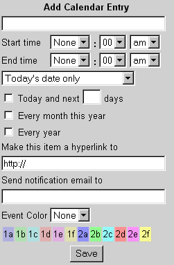 To add an entry, type your memo in the text field under Add Calendar Entry. You then will need to select the time(s) at which the event will take place. Beside Start Time, select the hour, minutes, and the time of day it will take place (AM or PM -- Morning or Afternoon). You can also select the End Time of the event (follow the same instructions as the Start Time). If you select "None" for the Start Time, the event will be added to the bottom of the daily list, at no particular time. You can use this when, for example, you know the day or date of the event, but don't know the exact time. If you select no End Time, then the event will simply not state an end time.